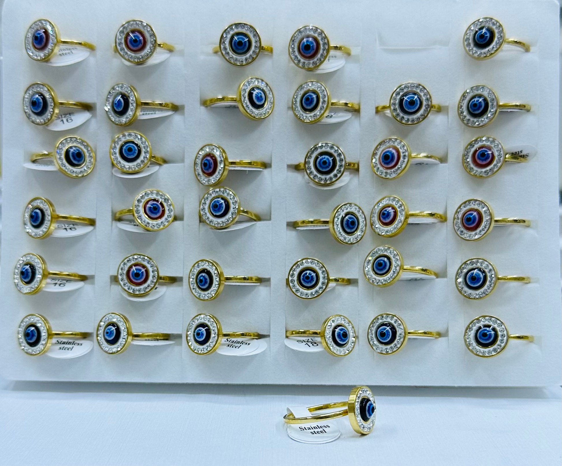 Anillo ojo turco dorado con piedra barro blanco por 36 und.