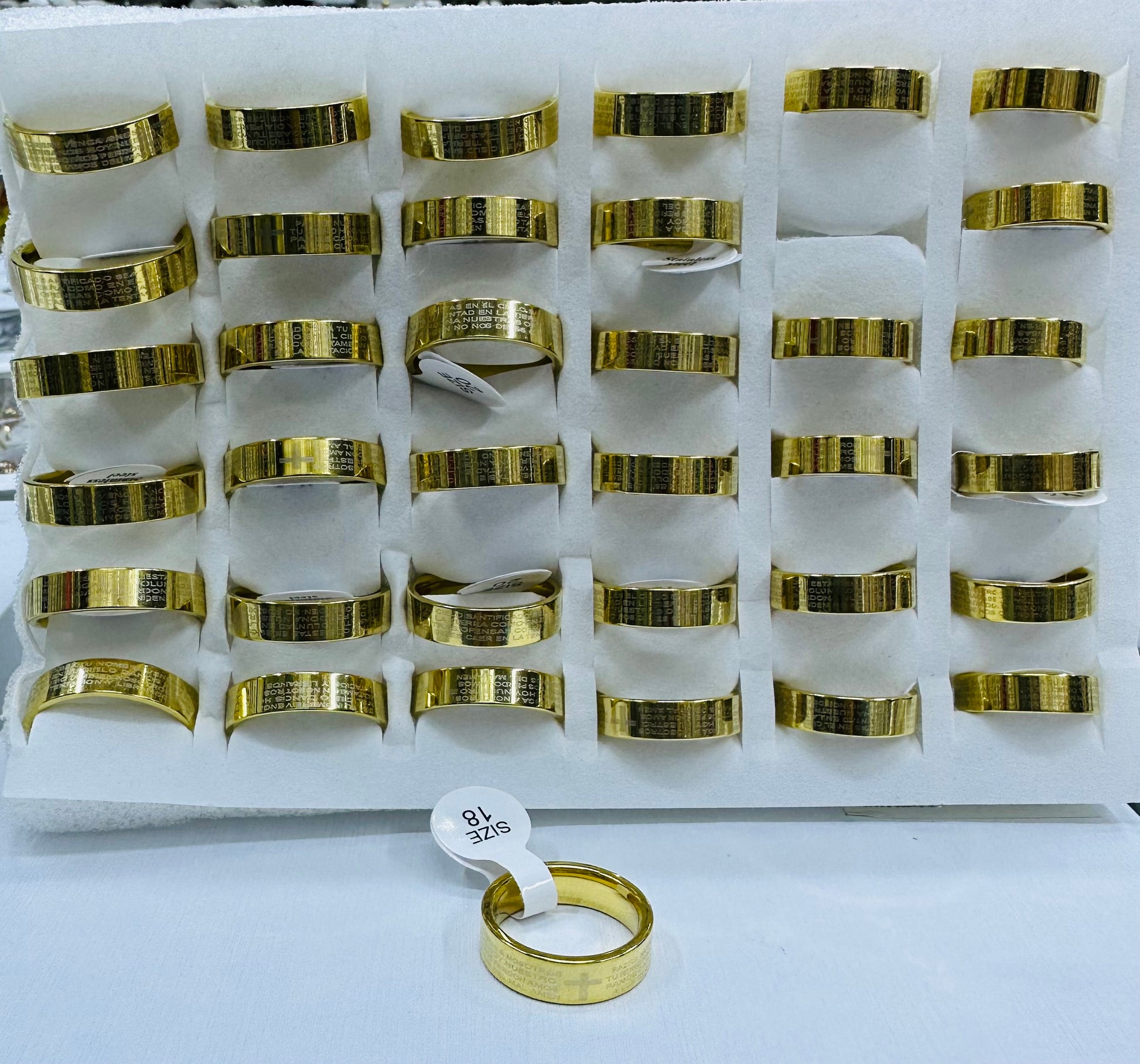 Caja de anillo padre nuestro dorado de 36 und, tallas surtidas del 17-22.