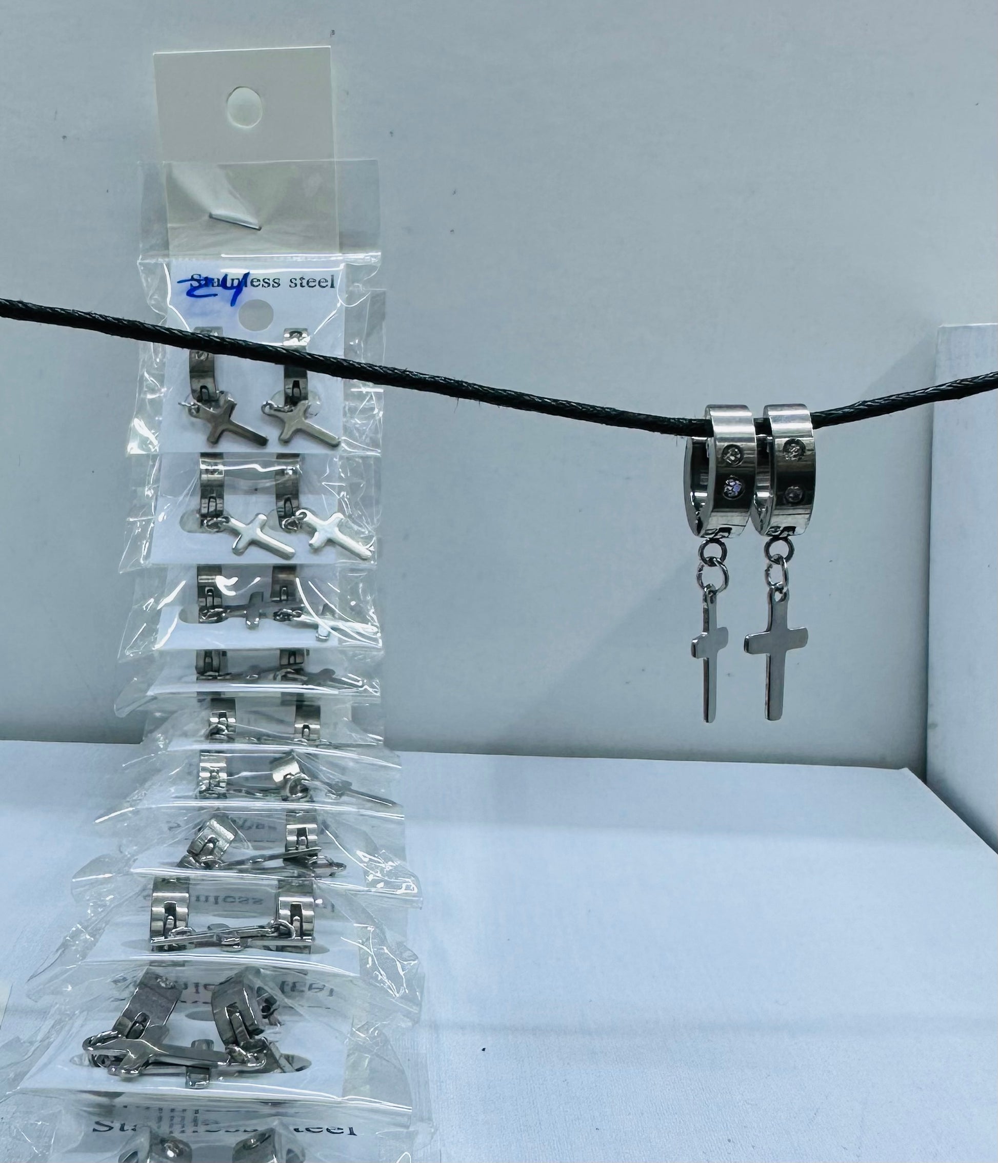 Arete de varón plateado cruz con piedra por 12 pares.